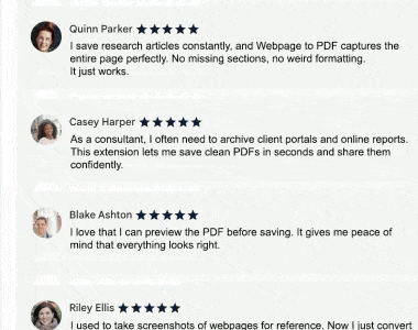 “I am a researcher and often need offline access to articles and sources. Webpage to PDF allows me to save webpages instantly and organize them in Google Drive. It has simplified how I collect and reference information.”